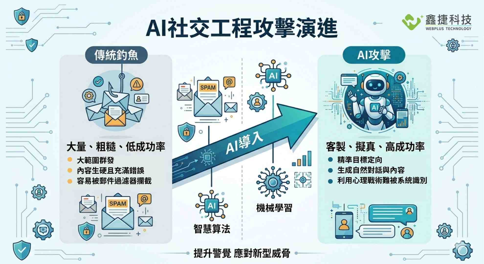 AI社交工程攻擊從傳統釣魚郵件演進為生成式AI客製化攻擊的比較圖