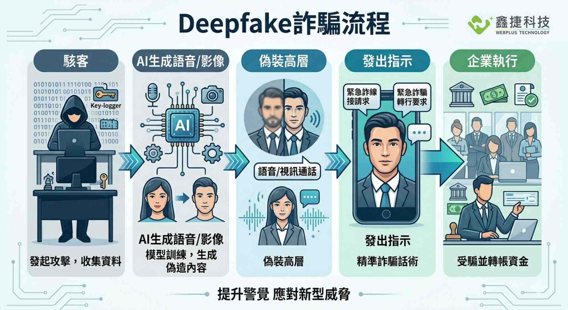 Deepfake技術在企業詐騙中的應用流程,透過偽造語音與影像進行社交工程攻擊